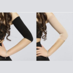 Slimming arm and thigh compression sleeves for women, available in black and beige, designed to provide gentle pressure for shaping, toning, and improving circulation.